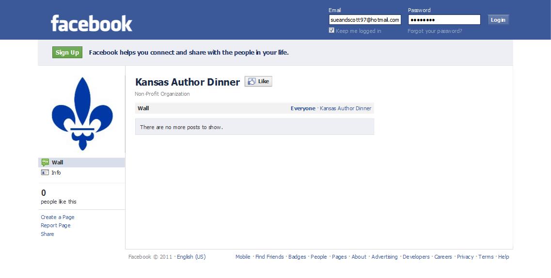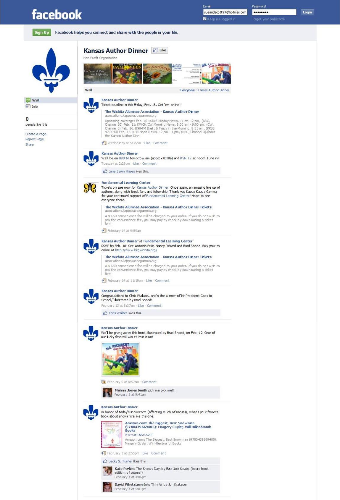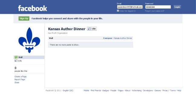 I volunteer for an event called the Kansas Author Dinner. The event was Thursday, February 24. The Kansas Author Dinner Facebook page has a small, yet loyal following (31 people like the page).