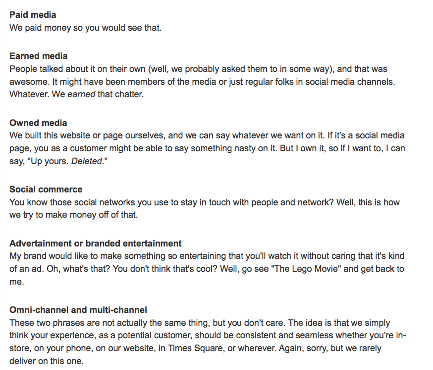 This article made me laugh: Marketing jargon translated for normal people (iMedia). Every industry has its own set of jargon. And the only people who really understand what they mean are the people who work in that industry. Here’s just a sample of what is in the article: