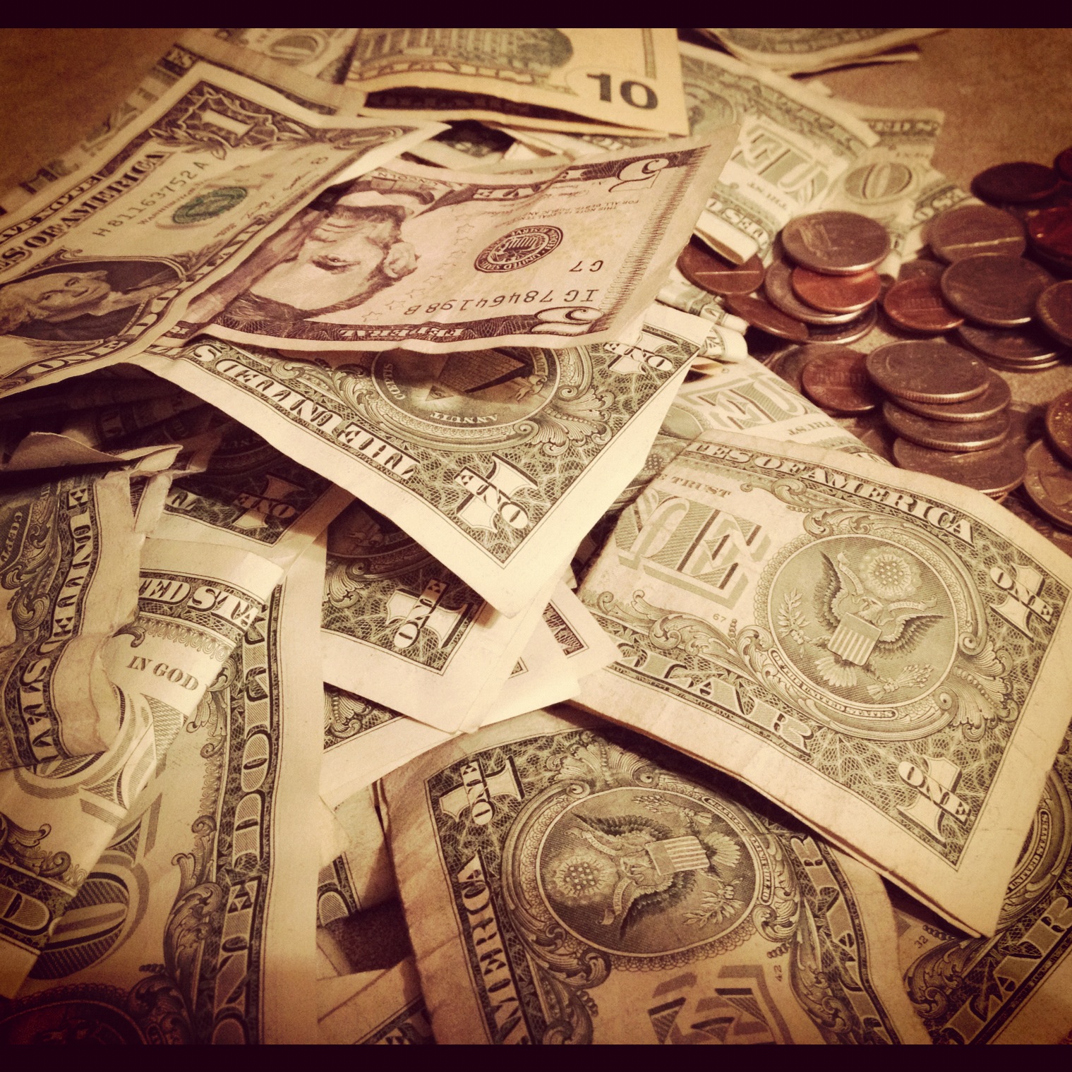 Need a stack of credit cards? A wad of bills? A calculator and a mortgage-type looking document? Coins in a jar marked “Retirement”? You have all those…just use your own items. The photo below is money I poured out from one of my boys’ piggy banks. It has an Instagram filter on it.