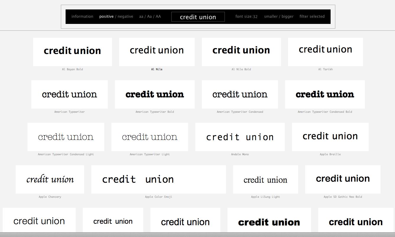 Don’t let anyone tell you fonts aren’t important. A great typeface is what holds your marketing materials together. Wordmark.it allows you to see how a word looks in all the fonts that are installed on your computer. See them on a white background, black background, all lowercase or all caps. This is a great way to find a new font, or isolate a word that you want to stand out in your materials. Here’s one I did using “credit union.”