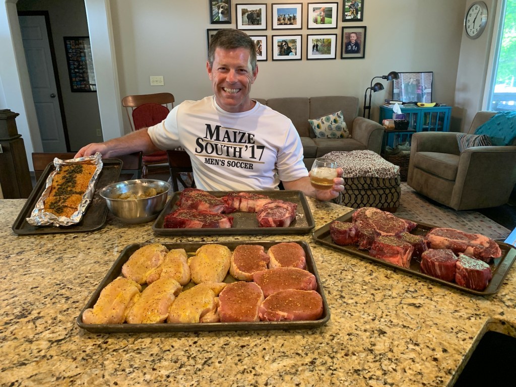After pictures, they all met up at our house for “dinner.” Scott had offered to grill fillets, ribeye, pork, chicken and shrimp. I made mashed potatoes, macaroni and cheese, fruit, and rolls.