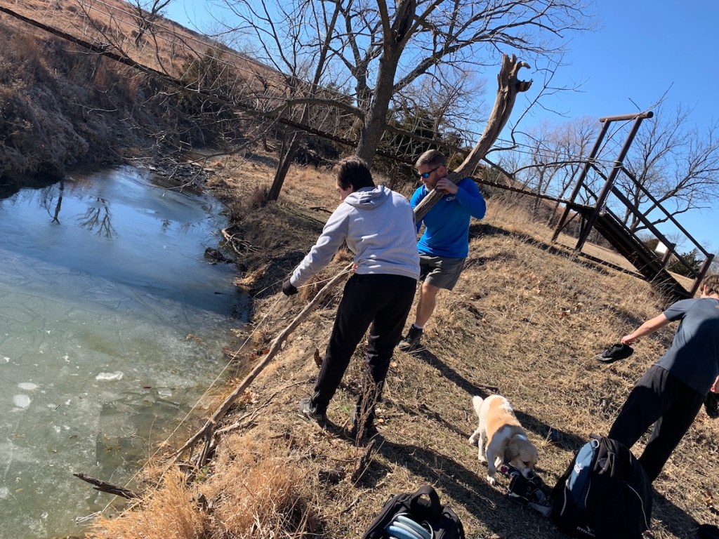 After 18 holes, we headed to Cottonwood Falls to eat our Christmas lunch (turkey sandwiches, apples, whale crackers, and pumpkin bread). The boys played a quick few holes at Swope Park, which has an 18 hold course, plus a nine hole “fun” course.
