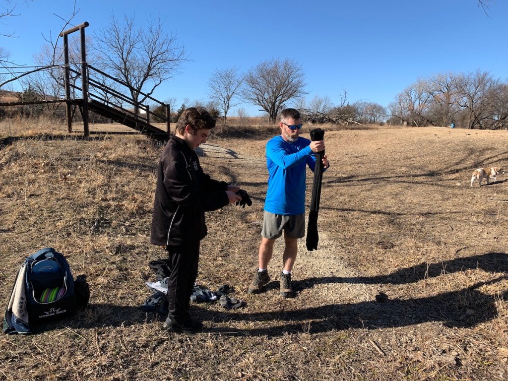 The creek was iced over, enough to hold a 17 pound dog, but not enough to hold a 125 pound 17 year old. I had *just* said, “don’t fall in,” and then went to look for Ali who was enjoying her freedom, leash-free. I came back to kid #2 wearing Scott’s clothes and Scott wringing out #2’s pants and jacket. The story goes that Scott told him it was fine to get his disc, and then the root he was holding on to gave away.