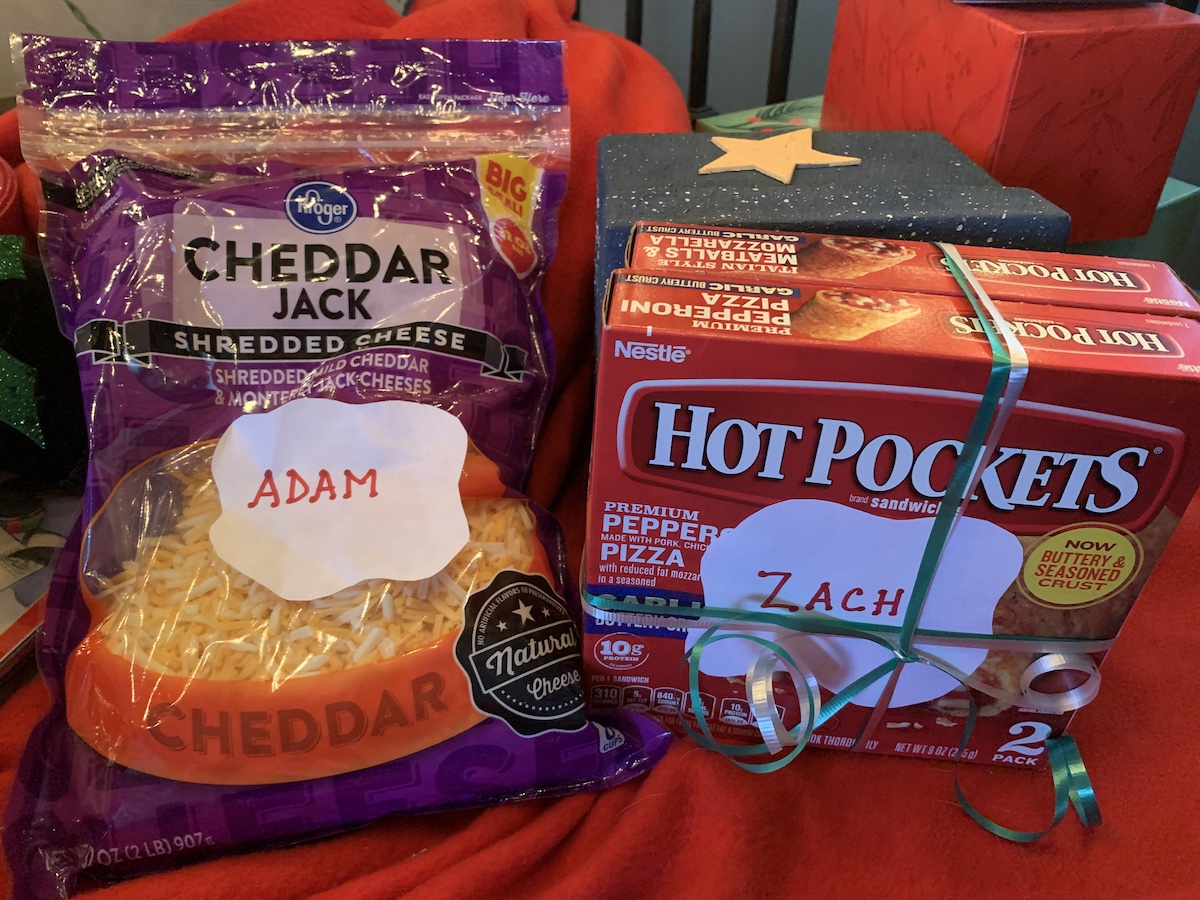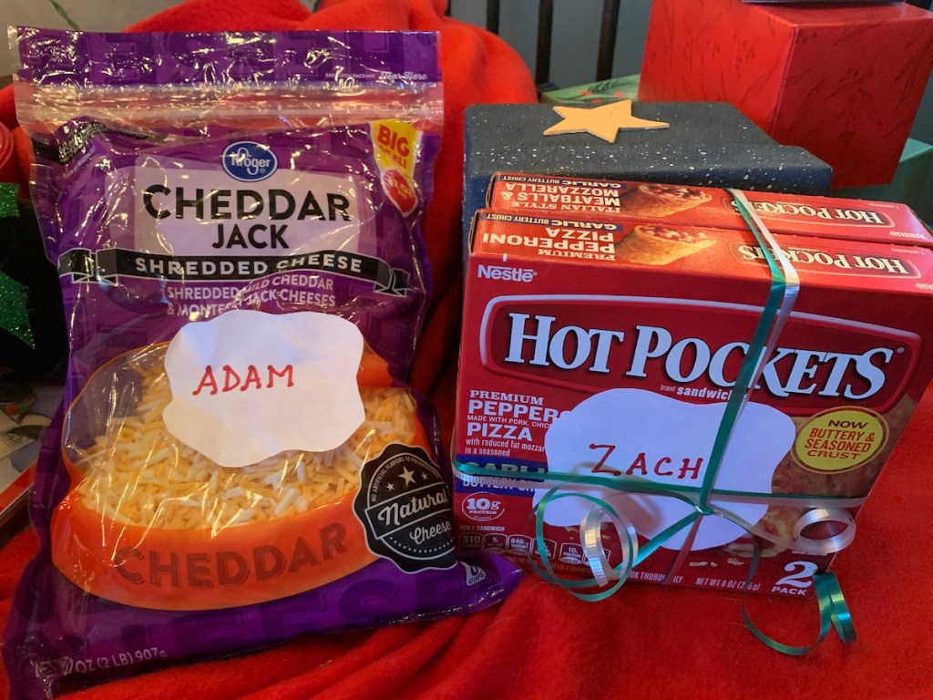 Kid #2 got sour cream and onion Pringles and two packages of hot pockets, and kid #1 got a 4 pound bag of shredded cheese and a box of Cheez its.