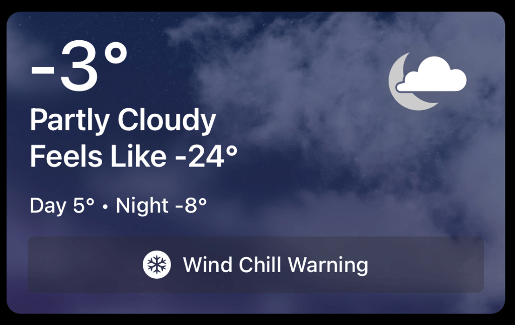 Our electricity was off for more than two hours. When it’s -22, it gets cold fast inside. Oh, we have a gas fireplace, except it turns on with an electric switch. When the electricity came back on it was 57 degrees in the house. π₯Ά Took a while to “heat up” to 67 degrees.