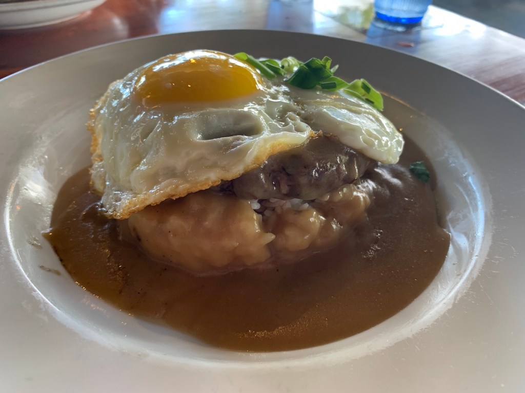 We made a stop at Starbucks, then to Lulu’s for lunch. Great meal – open air restaurant right across from Waikiki Beach. Zach and Adam ordered one of the “must have eats” in Hawaii — Loco Moco, rice with a beef patty topped with a fried egg and gravy.