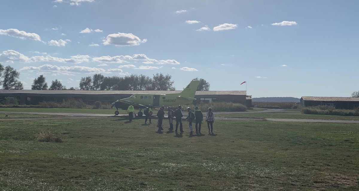 We drove to Kansas City on Sunday and met Pam and Ted there. Our plan was to eat a light picnic lunch. Our jump was at 1 p.m. It was super cloudy in the morning, so all the jumps were delayed until the clouds cleared up.