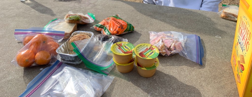 I didn’t quite pack enough for lunch… peanut butter and jelly sandwiches, turkey sandwiches, clementines, cheese, crackers, carrots, applesauce, snickerdoodle bread, and candy cane bark.