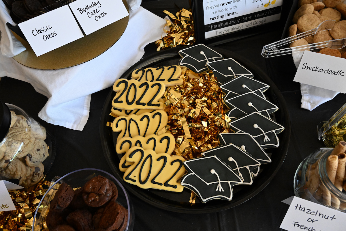 The theme was “sweet success” and se served seven different kinds of cookies (chocolate chip, two types of Oreos, pirouettes, snickerdoodle brownie bites, sugar cookies in the shape of graduation capes and “2022”). For those who needed a little saltiness, there were three types of potato chips (including Zach’s favorite, sour cream and onion). Our healthy options included veggie cups and grapes.