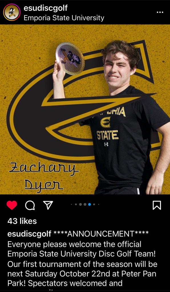 In July, ESU announced the formation of the first-ever competitive disc golf team at the school. It is coached by Eric McCabe, a world champion professional disc golfer who resides in Emporia.
