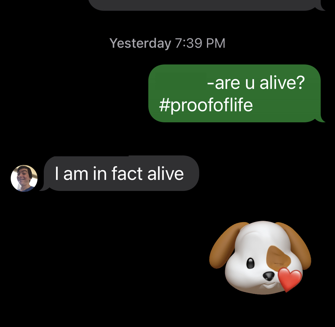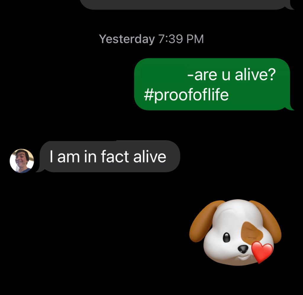 We typically talk or text with the boys regularly, but it had been a while since I had heard from Kid 1. Just making sure…