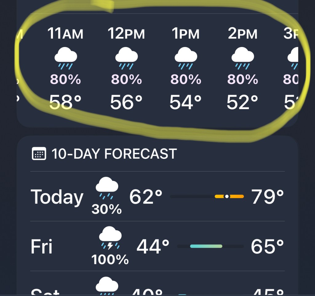 This was the weather on the last day. Just like the day before except 10 degrees colder. So, extra miserable. βοΈ π§οΈ π¨ π₯Ά