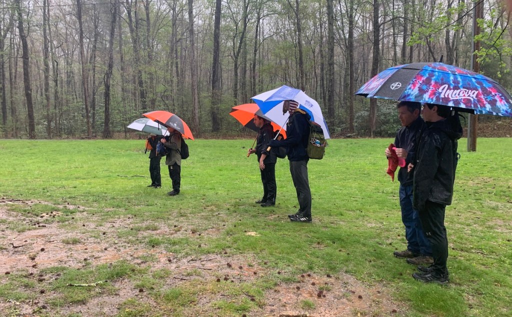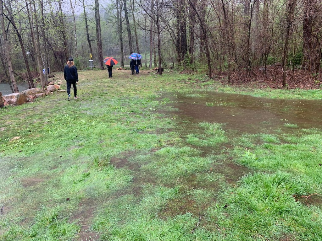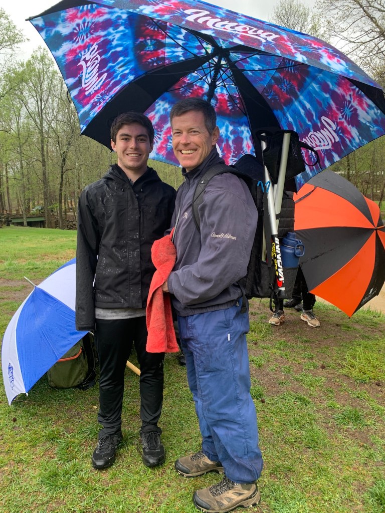 We bought a large umbrella at the course, because our two small ones were not big enough. Scott was Z’s caddy, and we needed to keep the discs dry. I guess bad things happen when your disc is wet.