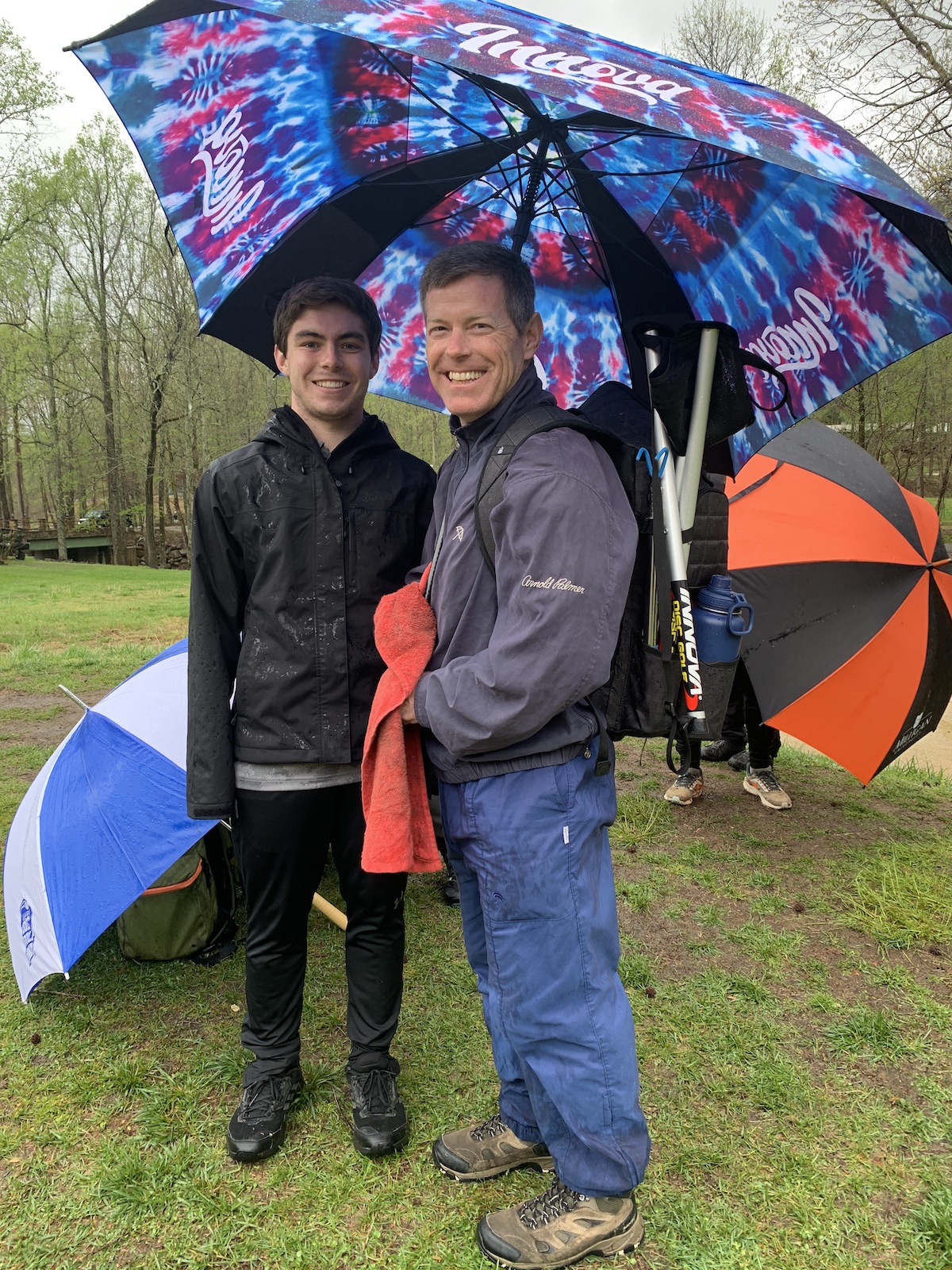 We bought a large umbrella at the course, because our two small ones were not big enough. Scott was Z’s caddy, and we needed to keep the discs dry. I guess bad things happen when your disc is wet.