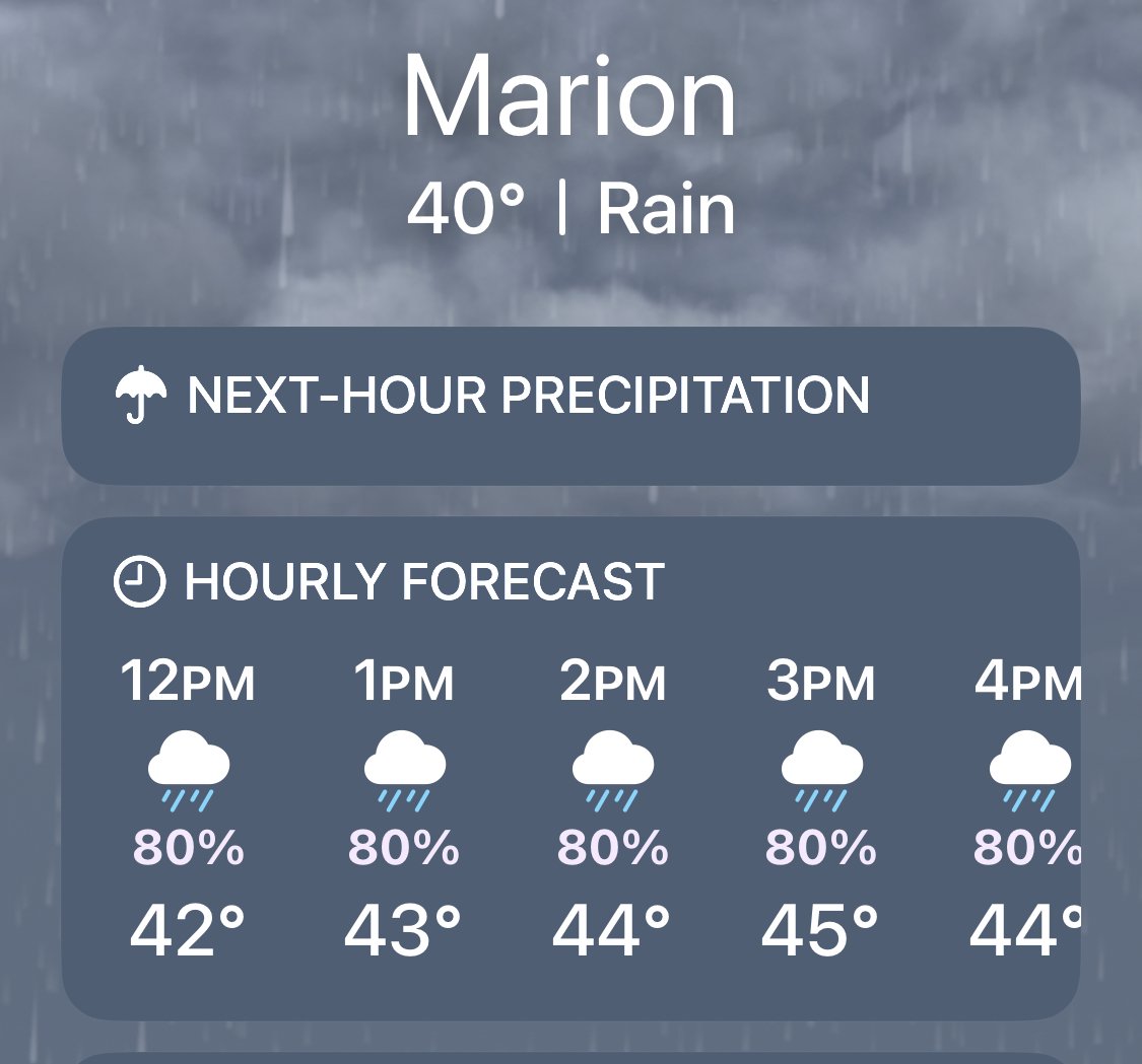 This was the weather on the last day. Just like the day before except 10 degrees colder. So, extra miserable. βοΈ π§οΈ π¨ π₯Ά