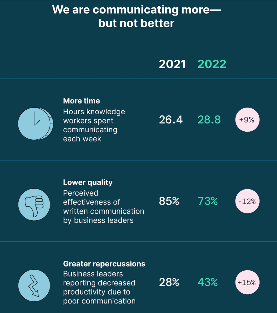 Grammarly’s State of Business Communications reveals poor communication is costing U.S. businesses $12,506 per employee per year ($12 trillion per year). If you have five employees, that’s about $60,000 per year, enough for another full time employee.