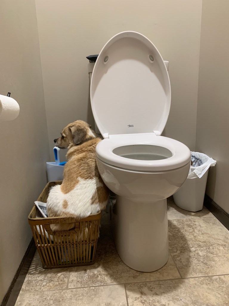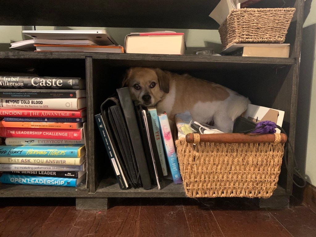 We’ve had several thunderstorms – and as Ali gets older, she gets more anxious. Now, Ali will follow us in the bathroom and try and get behind the toilet, crawl into the end table by the bed, or lay right up by your head in bed. See?