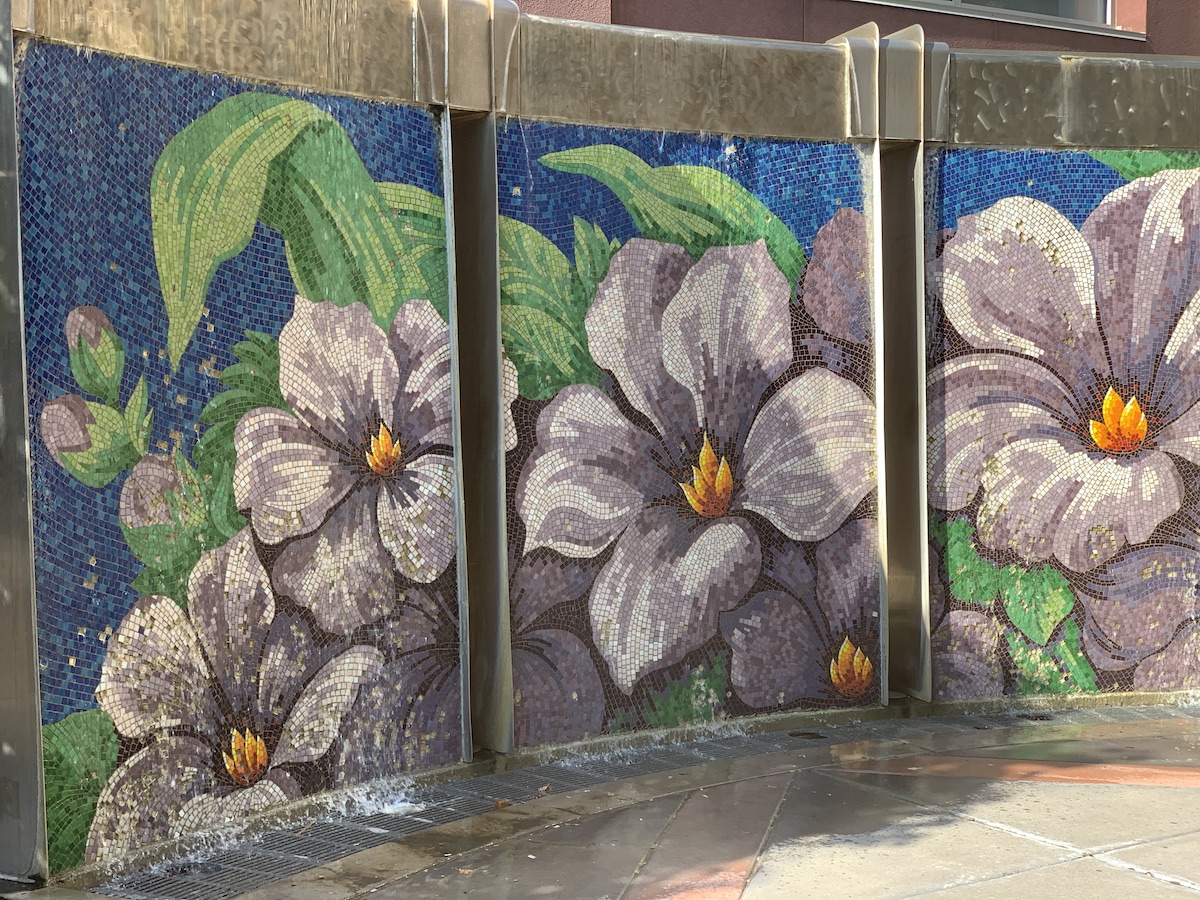 On Friday night, Scott and ate a Vora. The next morning, I walked to Grow (for coffee), and enjoyed the outside area at the Ambassador while Scott slept in. This is a water mural outside the hotel.