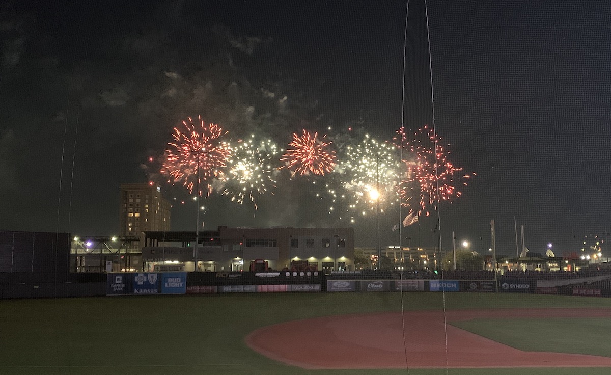 Once home, we headed to Riverfront stadium to watch the free community fireworks show. It was our first time at this event, and we arrived early because we thought it would be packed. Nope! We had our selection of seats. The Wind Surge baseball team was in Tulsa, and the game was playing on the scoreboard. One of the boy’s friends joined us.