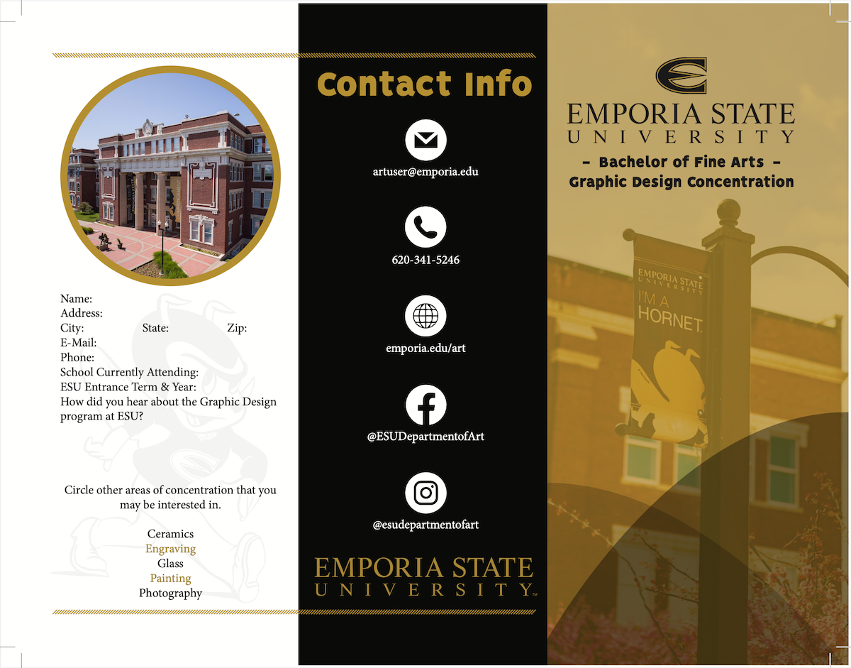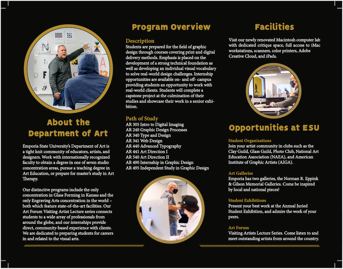 In Kid 2’s graphic design class, one of the projects was to create a trifold brochure about the ESU graphic arts department. Here’s his finished version (use the slider to view the front and back):