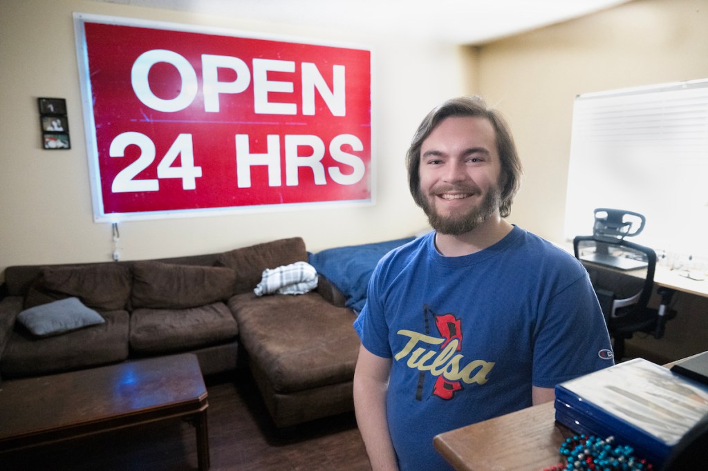 Our last parent’s weekend at the University of Tulsa! Oma and Papa joined us this year. I flew in from Dallas from a work meeting and Scott and Ali picked me up at the Tulsa airport on Friday afternoon. We rented an Airbnb near the campus. This one had two bedrooms, one bathroom, fenced backyard, sunroom, and horror movie weird room (you know, a weird room where everyone gets killed in slasher movies). We think this room used to be the garage, but it appeared to now be storage, laundry and a weird bathroom with a door to the backyard. π€