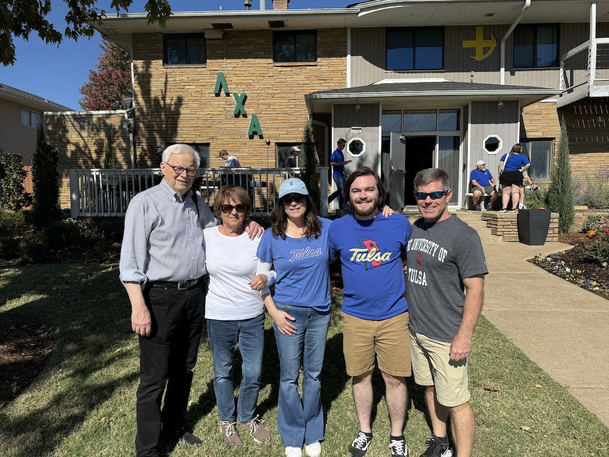 Our last parent’s weekend at the University of Tulsa! Oma and Papa joined us this year. I flew in from Dallas from a work meeting and Scott and Ali picked me up at the Tulsa airport on Friday afternoon. We rented an Airbnb near the campus. This one had two bedrooms, one bathroom, fenced backyard, sunroom, and horror movie weird room (you know, a weird room where everyone gets killed in slasher movies). We think this room used to be the garage, but it appeared to now be storage, laundry and a weird bathroom with a door to the backyard. π€